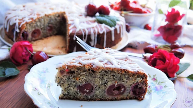 В купа се разбиват омекналото масло и захарта. Прибавя се сметаната и при постоянно разбиване едно по едно яйцата. Прибавят се бадемовата есенция, пресятото брашно заедно с бакпулвера, щипка сол, смлените бадеми, кората и сока от един лимон. Продуктите се разбъркват заедно, докато се смесят напълно. Накрая се налива сместа от мляко и маково семе и отново се разбърква. Добавят се почистените череши, отново се разбърква, след което подготвената смес се прехвърля в намазнена и набрашнена форма или тавичка.