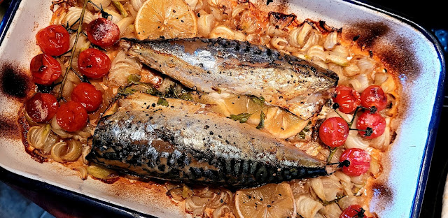 По желание от страни на печената скумрия могат да се сложат чери доматчета.